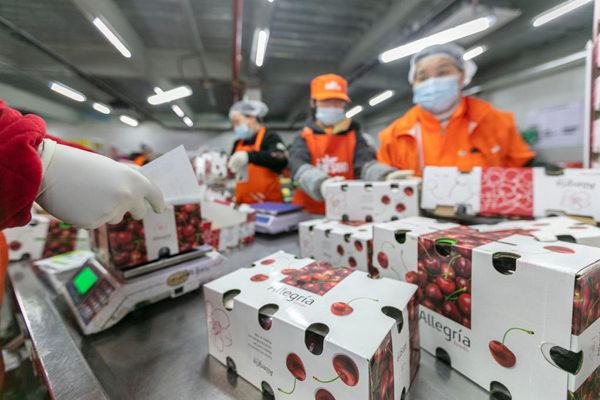 工作人員在綜合加工包裝中心包裝來自智利的車?yán)遄?。新華社記者 王翔 攝