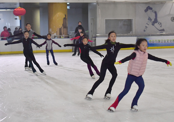 在陜西西安市奧佳冰上運動俱樂部內,隊員們在練習花樣滑冰。(資料照片)
