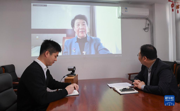 3月8日,全國人大代表、山西省昔陽縣大寨鎮大寨村黨總支書記郭鳳蓮在駐地與農業農村部工作人員視頻連線。新華社記者 胡喆 攝