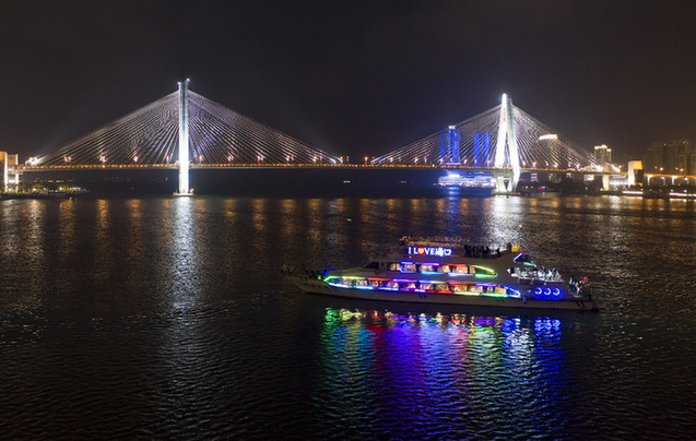 來自北京的游客楊夢蝶第一次乘坐游船欣賞海口夜景。“看到了海口不一樣的一面,在游船上體驗夜晚的濱海風光感覺很特別,也非常休閑和放松。”她說。