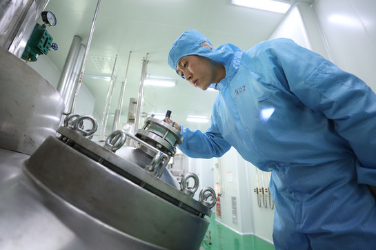 寧夏恒康科技有限公司員工正在對鹽酸二甲雙胍生產(chǎn)設(shè)備結(jié)晶釜進(jìn)行檢查。 新華社記者 呂澤 攝