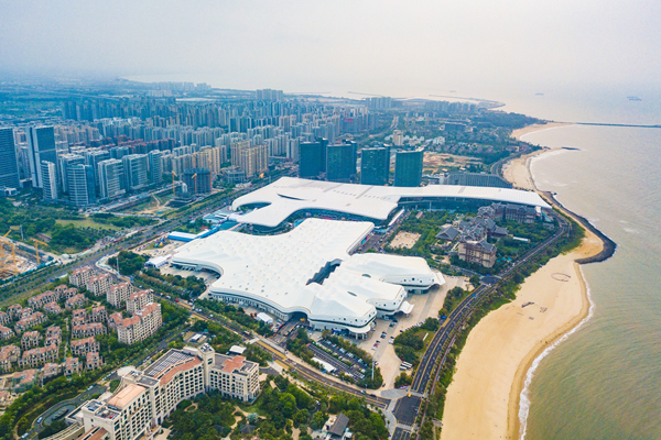 4月7日拍攝的第三屆中國國際消費品博覽會舉辦地——海南國際會展中心(無人機照片)。新華社記者 蒲曉旭 攝