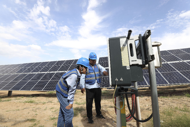 國(guó)家電投五凌電力余丁光伏電站職工在檢修設(shè)備。新華社記者 盧鷹 攝