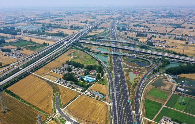 京滬高速公路擴建工程楚州樞紐段現(xiàn)場(6月6日攝,無人機照片)。