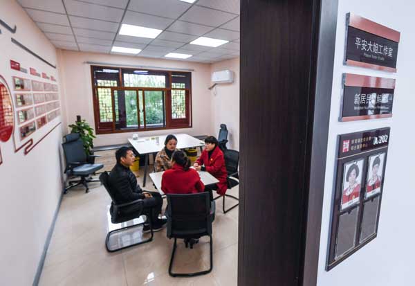 在浙江省湖州市織里鎮社會治理綜合服務中心調解室,“平安大姐”工作室的志愿者對一起糾紛進行調解(2019年11月29日攝)。新華社記者 徐昱 攝