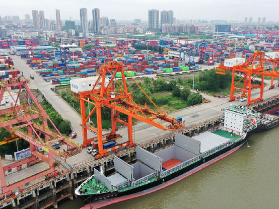 “華航漢亞2號”貨輪停靠在武漢新港陽邏集裝箱碼頭進(jìn)行裝箱作業(yè)(2020年5月9日攝,無人機(jī)照片)。新華社發(fā)(趙軍 攝)
