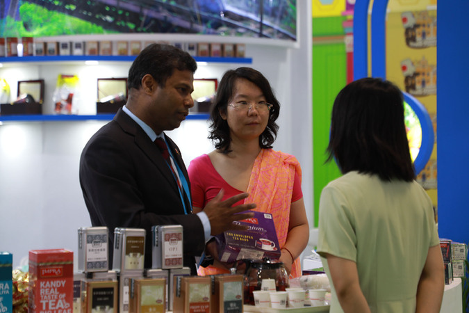 7月7日,斯里蘭卡展商在第28屆蘭洽會上向參會者推介商品。新華社記者 張智敏 攝