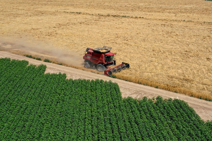 在新疆呼圖壁縣五工臺鎮小泉村,農機手駕駛聯合收割機收割小麥(7月15日攝,無人機照片)。