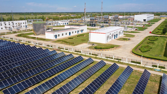 長(zhǎng)慶油田第五采氣廠蘇里格天然氣第六處理廠廠區(qū)內(nèi)的光伏發(fā)電站。 記者 王鵬 攝
