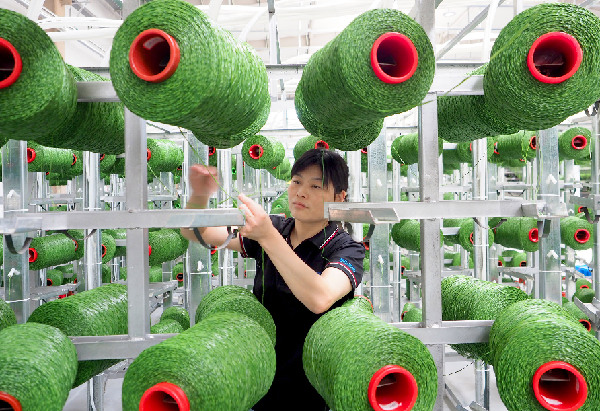 在山東省樂(lè)陵市泰山體育產(chǎn)業(yè)集團(tuán)有限公司,工人在人造草坪智能化生產(chǎn)車間作業(yè)。