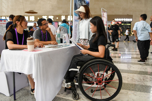 求職者在山東省殘疾人就業(yè)專場(chǎng)招聘會(huì)上咨詢崗位信息。資料照片