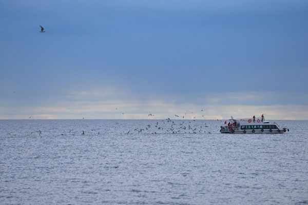 八月四日,游客在呼倫貝爾呼倫湖旅游景區乘坐觀光艇游玩。新華社記者 徐欽 攝