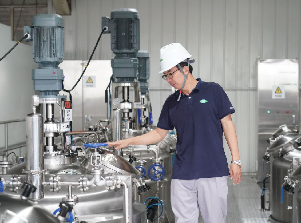 在北京微構(gòu)工場生物技術(shù)有限公司中試車間,工作人員查看配料罐的工作情況。
