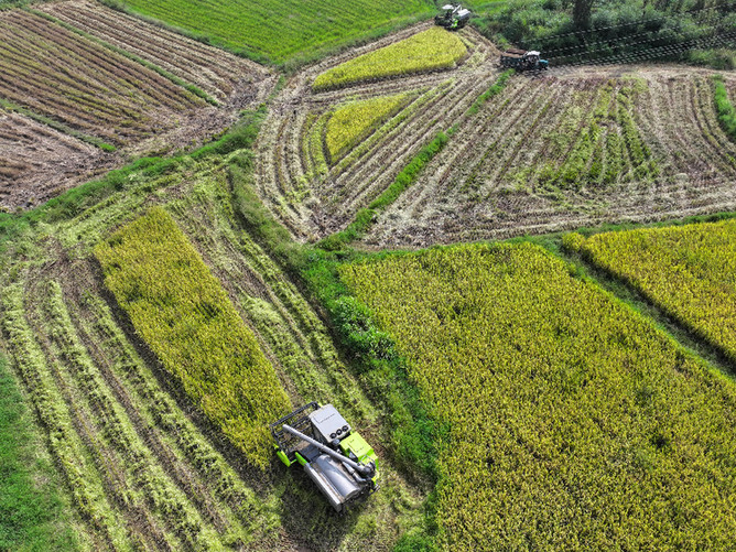 金秋時節,瀏陽市沿溪鎮種植的中稻迎來收獲季,當地農民搶抓農時收割水稻,稻田里一派繁忙景象。