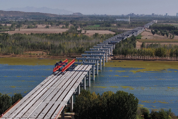 圖為工人在唐山灤州市內(nèi)的秦唐高速公路跨灤河大橋建設(shè)工地施工(無(wú)人機(jī)照片)。