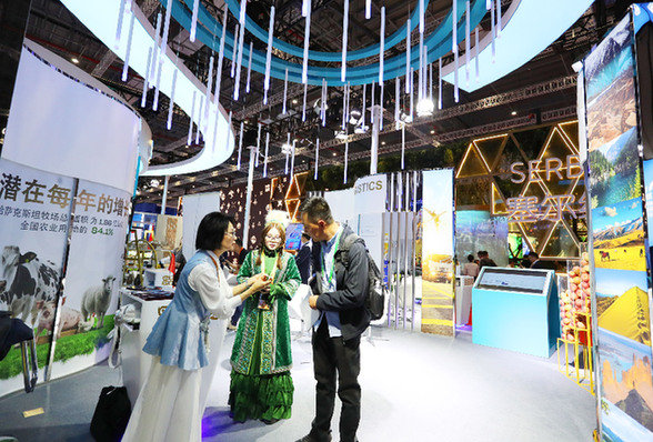 11月6日,一名參觀者(右)在第六屆進博會國家展哈薩克斯坦展臺與工作人員交談。第六屆進博會國家展全面恢復線下舉辦,洪都拉斯、塞爾維亞、越南、南非、哈薩克斯坦作為本屆進博會主賓國在國家展亮相?!⌒氯A社記者 方喆 攝