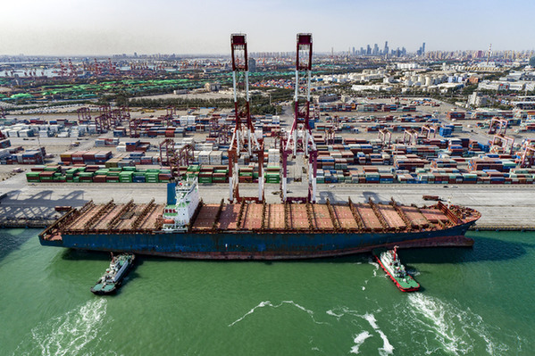 一艘貨輪停靠天津港。資料照片
