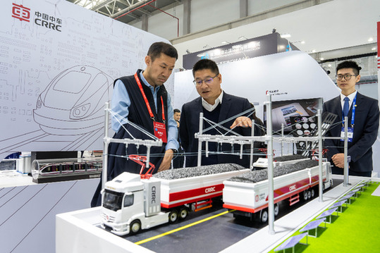 12月8日,在2023中國國際軌道交通和裝備制造產業博覽會上,觀眾(左一)了解一款智能貨車。新華社記者 陳思汗 攝