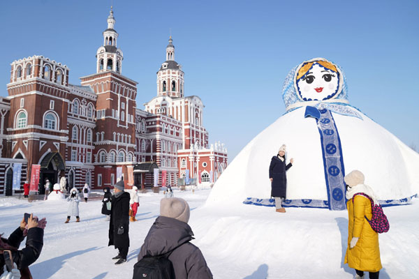 1月7日,游客在伏爾加莊園的一處大雪人前游玩、拍照。時(shí)下正值冰雪季,“冰城”哈爾濱市的著名旅游景點(diǎn)伏爾加莊園變身“冰雪城堡莊園”,吸引游客前來(lái)欣賞歐式建筑,享受冰雪樂(lè)趣。
