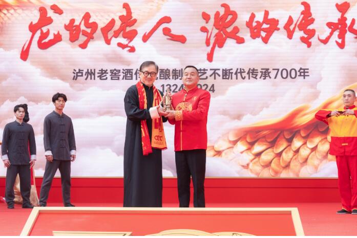 大典現場,瀘州老窖和國窖1573濃香700年紀念酒舉行了全球首發儀式。隨后,知名演員成龍正式接受瀘州老窖·國窖1573文化傳播大使的身份授予,攜手瀘州老窖共同走入中國濃香700年的匠心傳承之路。