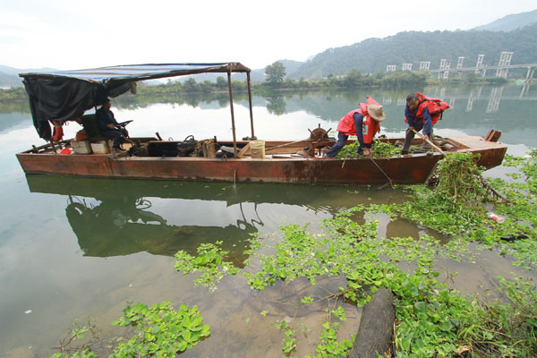 在閩江上游富屯溪福建省南平市順昌縣埔上鎮口前村河段,工作人員駕船打撈河面上的漂浮物。新華社發 (陳柏材 攝)