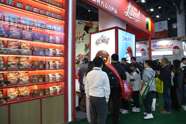 在10號館進口食品展區,比利時國家(商品)館邀請了一家比利時巧克力廠設立展位。“這里的人真的非常多。比利時是以巧克力、啤酒、鉆石和藍精靈聞名的國家,而我們是唯一能使用藍精靈IP的巧克力廠家,所以大家對我們的產品非常感興趣。”這家比利時巧克力廠的負責人莉莉·利比特表示。