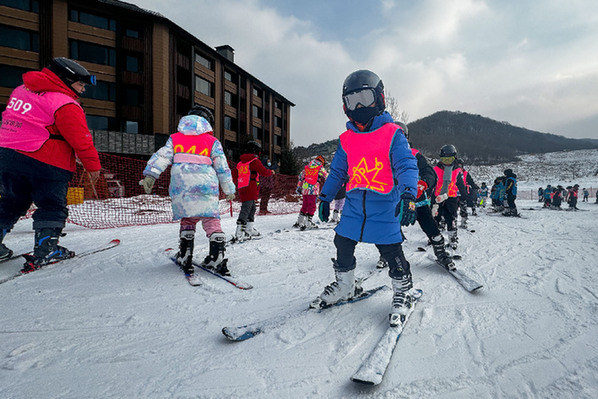 2023年12月5日,在吉林省吉林市萬科松花湖度假區,小朋友們在教練的指導下練習滑雪動作。 記者 許暢 攝