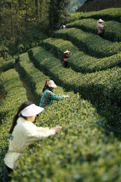 3月27日,茶農在安康市漢濱區雙龍鎮一處茶山上采茶。 記者 邵瑞 攝