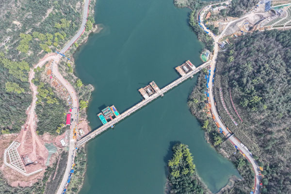 位于重慶市銅梁區的成渝中線高鐵玄天湖大橋建設現場(無人機照片)。
