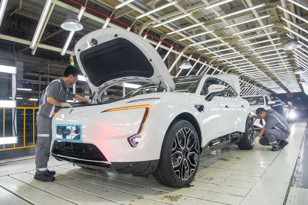 “重慶造”新能源汽車加速走向國內外市場。在位于重慶市江北區的長安汽車生產基地車間內,工作人員在新能源汽車阿維塔生產線上作業。記者 唐奕 攝