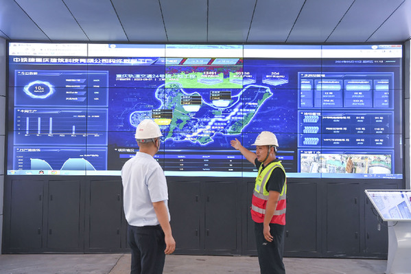 中鐵建重慶建筑科技有限公司工作人員向來(lái)訪者介紹該公司的構(gòu)件數(shù)字工廠系統(tǒng)。新華社記者 王全超 攝