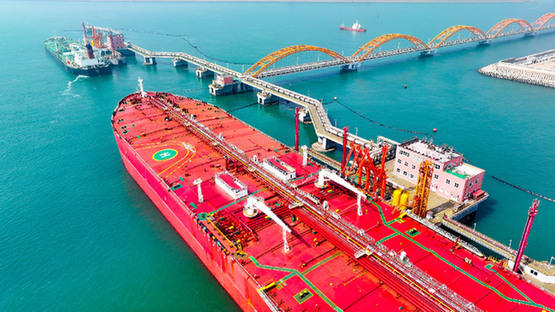 圖為在山東港口日照港嵐山港區30萬噸級油品碼頭,船舶??窟M行卸油作業(無人機照片)。 新華社記者 郭緒雷 攝