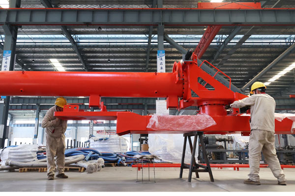5月27日,江蘇連云港海州經濟開發區新浦工業園一家企業的工人在組裝一臺流體裝卸臂。新華社發 耿玉和 攝