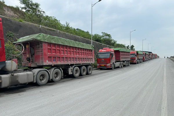 連接烏揚公用碼頭的公路上,裝滿碎石的大貨車一眼望不到頭。一位司機告訴記者,原來卸貨裝船根本不用排隊,現(xiàn)在排七八個小時是常態(tài)。