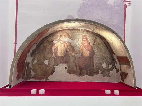 ??這是“描繪珀耳修斯和安德羅墨達的彩繪石膏壁畫”(真品)(6月13日攝)。新華社記者 張玉潔 攝