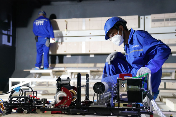 圖為近日在中國船舶大連造船公司LNG綜合培訓中心內,學員在練習粘連作業。 新華社記者 樊雨晴 攝