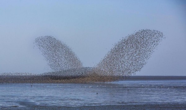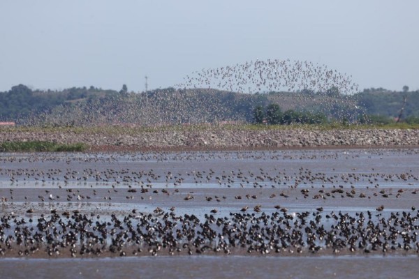 ??鴨綠江口候鳥棲息地的壯觀“鳥浪”。(鴨綠江口濕地保護中心供圖)