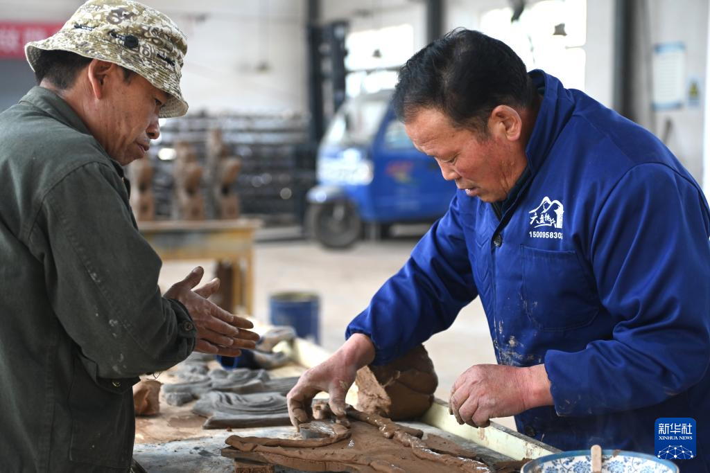 10月30日,在固原市隆德縣魏氏磚雕傳承基地,卜文俊(右)在生產車間對工人進行指導。