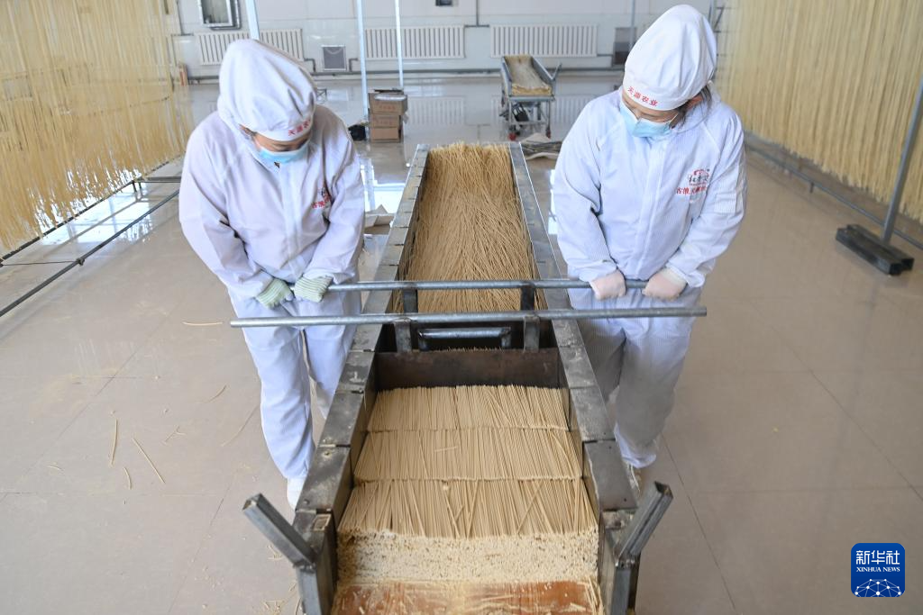 1月16日,在位于古浪縣泗水鎮的一家企業手工掛面生產車間,工人切割晾干的古浪手工掛面。