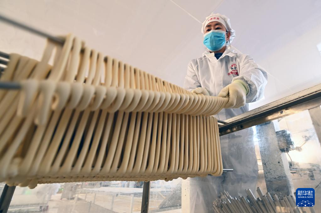 春節臨近,在甘肅省武威市古浪縣,“非遺”產品——古浪手工掛面訂單大增,當地一些企業的掛面生產車間內,工人們抓緊制作手工掛面。古浪手工掛面歷史悠久,以國家農產品地理標志產品古浪紅光頭小麥面粉為原料,經十多道工序加工而成。2024年12月,古浪手工掛面制作技藝被列入甘肅省第五批省級非物質文化遺產代表性項目名錄。