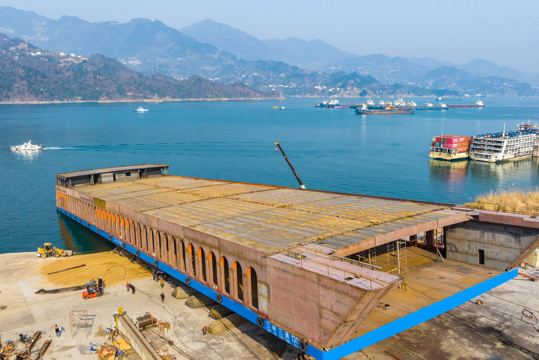 三峽庫(kù)區(qū)首艘新能源滾裝船近日在湖北省秭歸縣華星船務(wù)有限公司順利下水。該貨輪是三峽集團(tuán)聯(lián)合交通運(yùn)輸部長(zhǎng)江航務(wù)管理局共同打造的新能源運(yùn)用試點(diǎn)示范船舶,設(shè)計(jì)載重8000多噸,采用“甲醇單一燃料發(fā)電+電力驅(qū)動(dòng)”動(dòng)力系統(tǒng)。圖為秭歸縣華星船務(wù)有限公司建造的新能源滾裝船從制造平臺(tái)向江上移動(dòng)。