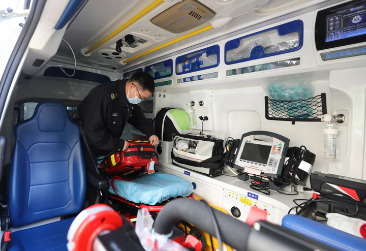 急救醫(yī)師曹鑫在出發(fā)前檢查整理救護(hù)車急救藥品和裝備。新華社記者 方喆 攝