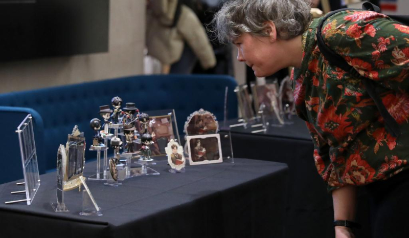 2024年11月21日,在英國倫敦大英圖書館,一名女子觀看中國網絡文學作品的周邊產品。新華社記者李穎攝