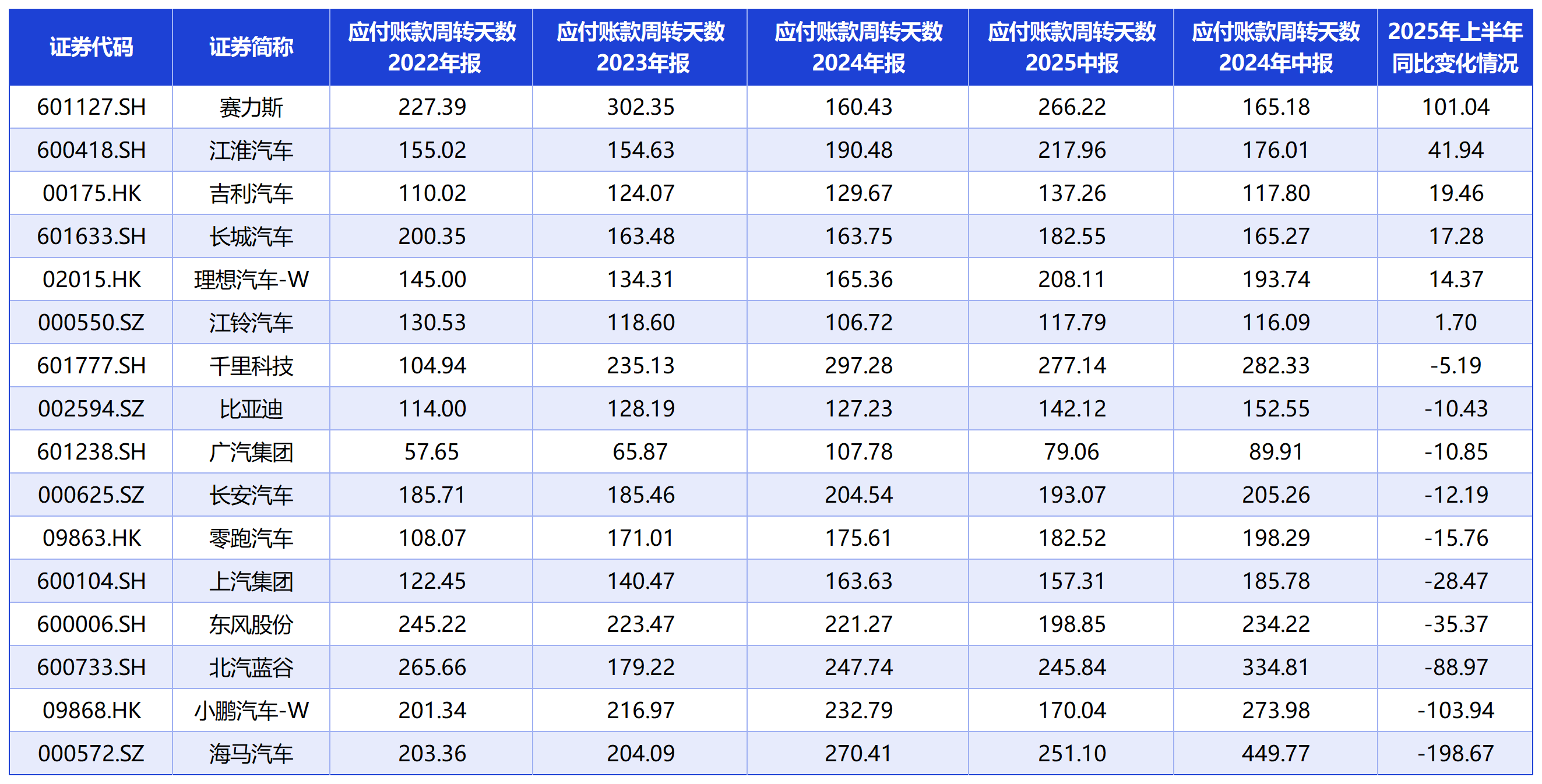 從應付賬款周轉角度來看,今年上半年,16家車企中有10家車企應付賬款周轉天數較2024年同期減少,車企數量占比為62.5%。長城汽車、理想汽車、賽力斯等車企應付賬款周轉天數同比均增加。特別是賽力斯,今年上半年的應付賬款周轉天數為266.22天,較2024年同期的165.18天增加了101.04天,其增幅位居16家車企之首。