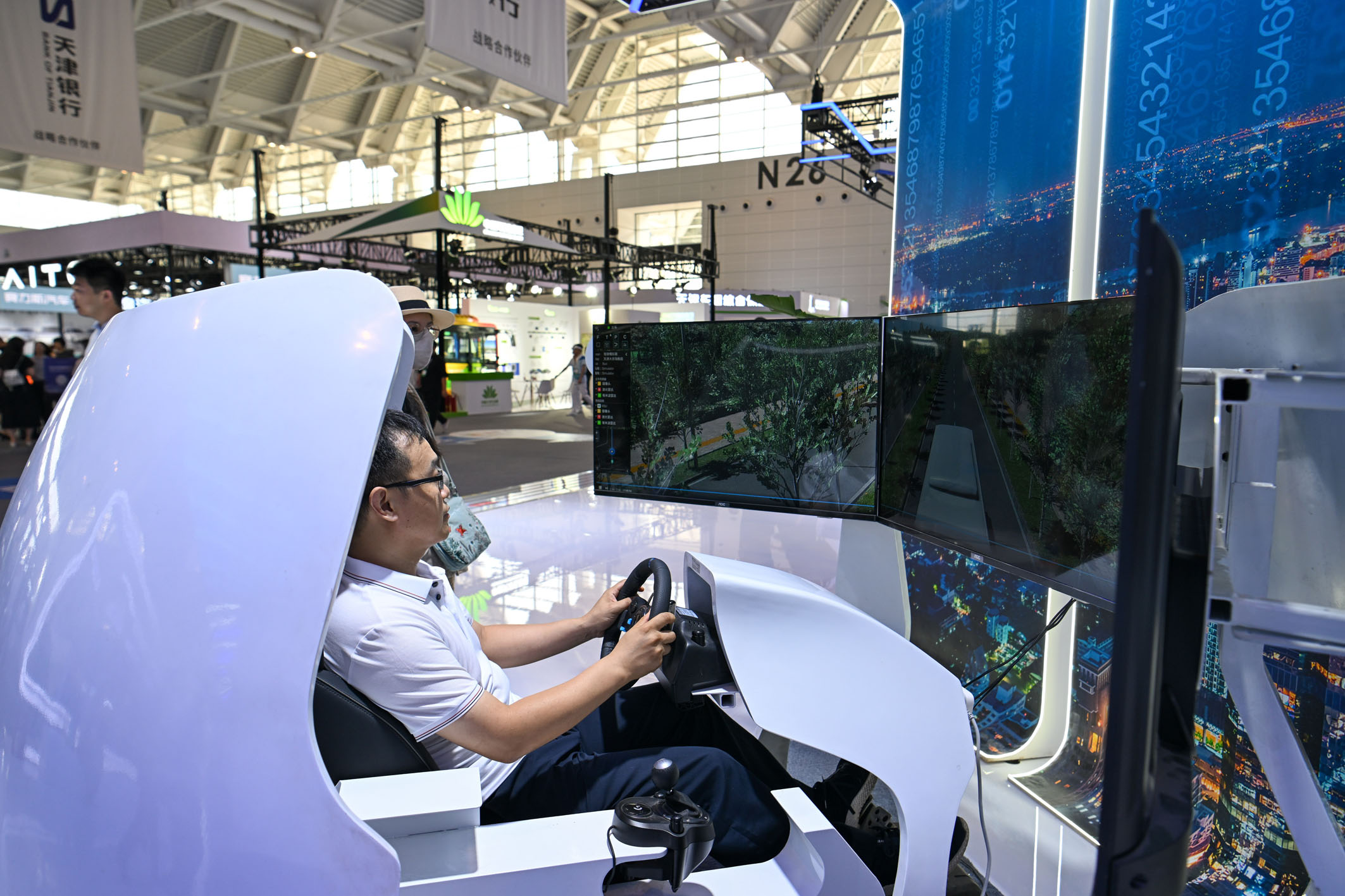 圖為參觀者在展會現場體驗天津大學設計研發的一款可進行多場景智能網聯車測試的仿真模擬器。(資料照片)