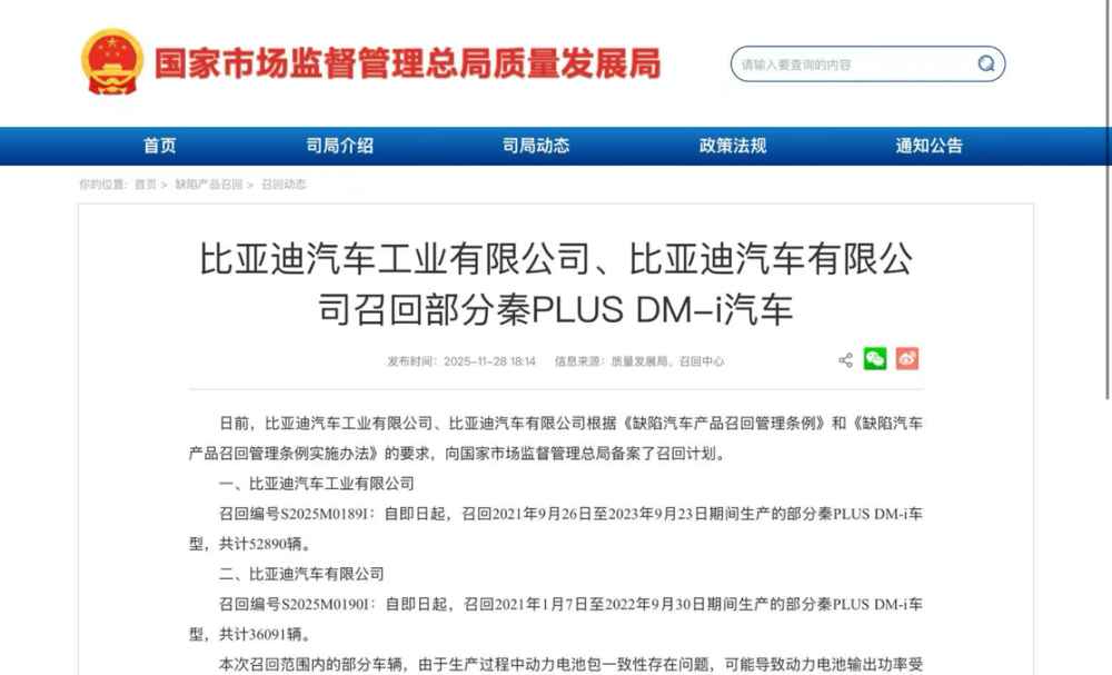 市場監管總局網站11月28日消息顯示,日前,比亞迪汽車工業有限公司、比亞迪汽車有限公司根據《缺陷汽車產品召回管理條例》和《缺陷汽車產品召回管理條例實施辦法》的要求,向國家市場監督管理總局備案了召回計劃,決定自即日起召回部分秦PLUS DM-i車型,共計88981輛。具體來看: