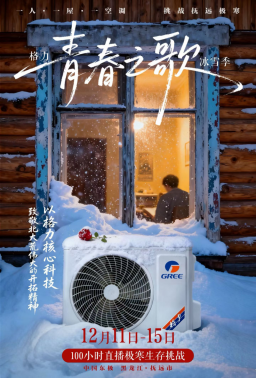 在冰天雪地里搭建一間“格力小屋”,里面擺滿全能王柜機、508雪龍冰箱、如悅洗烘一體機、北歐時光篝火暖風機、6個9凈熱一體機、無霧加濕器等格力全套健康家電產品。在無額外熱源的情況下,這些產品要連續100小時穩定運行,這就是格力“極寒直播”的全部場景。