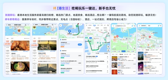針對港珠澳大橋珠海公路口岸的復(fù)雜路況,高德還推出了精準車道引導(dǎo)功能,通過實時定位與車道級導(dǎo)航,為車主提供無需擔心繞路或誤入的解決方案,系統(tǒng)動態(tài)播報專用通道指引,大幅提升通關(guān)效率。該功能覆蓋港珠澳大橋及香港主干道,精準指引復(fù)雜路況、靠右側(cè)行駛及變道提醒,為新手帶來如同內(nèi)地高速的導(dǎo)航體驗,輕松應(yīng)對跨境駕駛差異。此外,智能周邊探索功能可搜索停車場并推薦附近景點、充電點(含國標樁)及酒店,一站式規(guī)劃跨境行程,讓自駕更加省心省力。