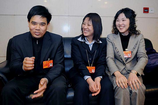 | 3月3日,三位農民工全國人大代表康厚明(左)、胡小燕(中)和朱雪芹(右)在北京交談。新華社