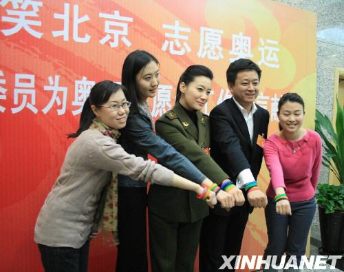 3月9日,全國人大代表譚晶(中)、全國政協委員朱軍(右二)和其他志愿者合影。 當日,十幾位全國人大代表和全國政協委員一起來到中國國際會展中心,參加由北京奧組委舉辦的兩會代表委員獻計奧運志愿者工作座談會。 新華社發(fā)